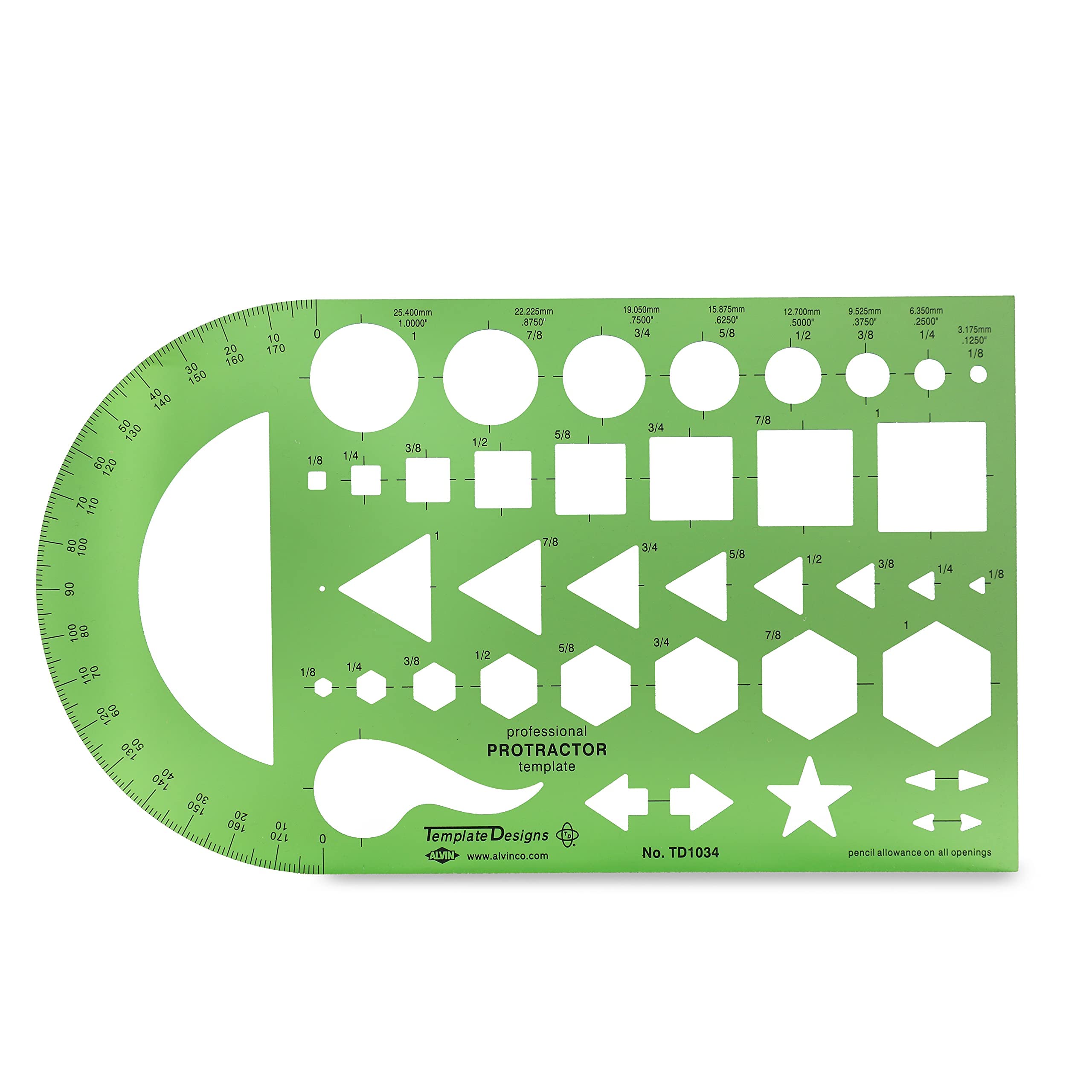 ALVIN, TD1034, Plastic Green General Purpose Protractor Template, Ideal for Planning and Drafting - 5.5 x 9.5 x .030 Inch—